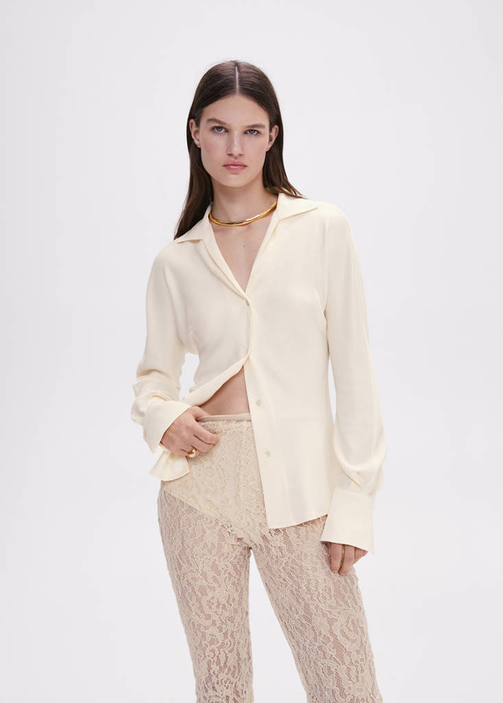 Selection Kollektion. Fließender Stoff. Tailliertes Design. Hemdkragen. Langer Ballonärmel. Knopfverschluss vorne. Abgerundeter Saum. Drapierte Details