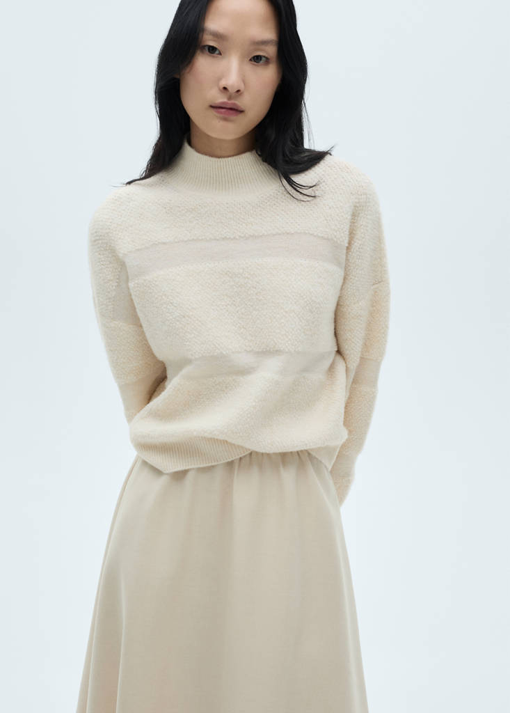 Strickstoff. Gerades Design. Perkins-Kragen. Lange Ärmel. Kontrasteinsätze. Ohne Verschluss