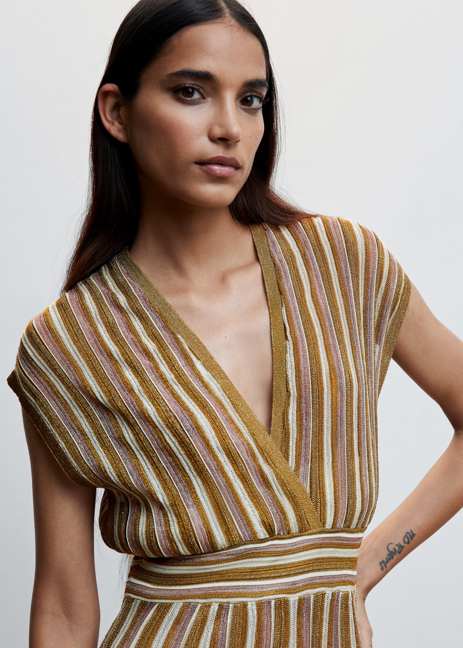 Feinstrick. Gerades Design. Langes Design. Streifenmuster. V-Ausschnitt. Ärmellos. Metallic-Details. Party- und Zeremonie-Kollektion.