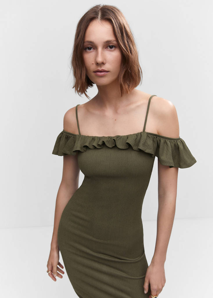 Strukturierter Stoff. Schmaler Schnitt. Mid-Design. Gerader Ausschnitt. Rüschendetail. Spaghettiträger. Ohne Verschluss. Zierausschnitt hinten