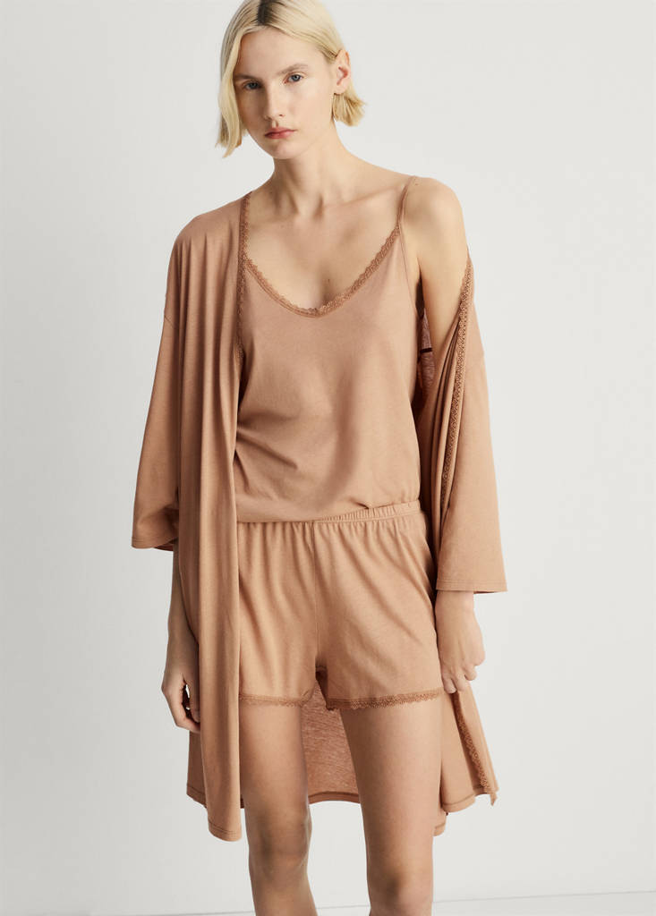 Baumwoll-Morgenmantel mit farblich kontrastierender Spitze