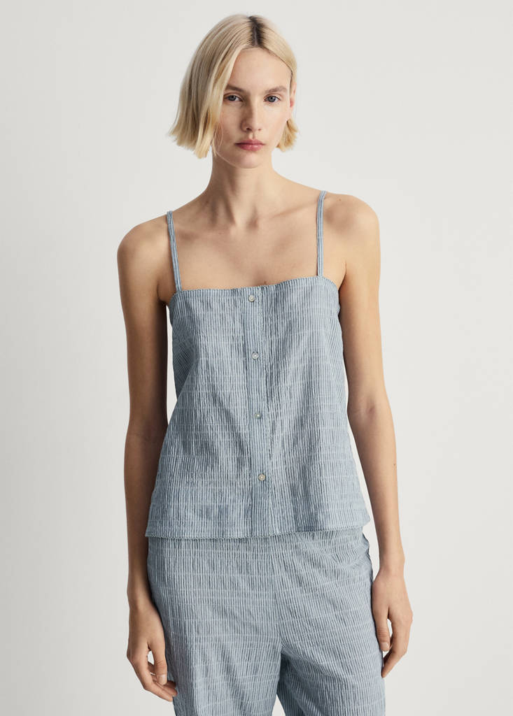 Pyjamahose. Seersucker-Stoff. 100 % Baumwolle. Gerader Ausschnitt. Träger. Knopfverschluss. Gestreifter Stoff. Zweifarbiges Design. Kurzes Design. In verschiedenen Farben erhältlich