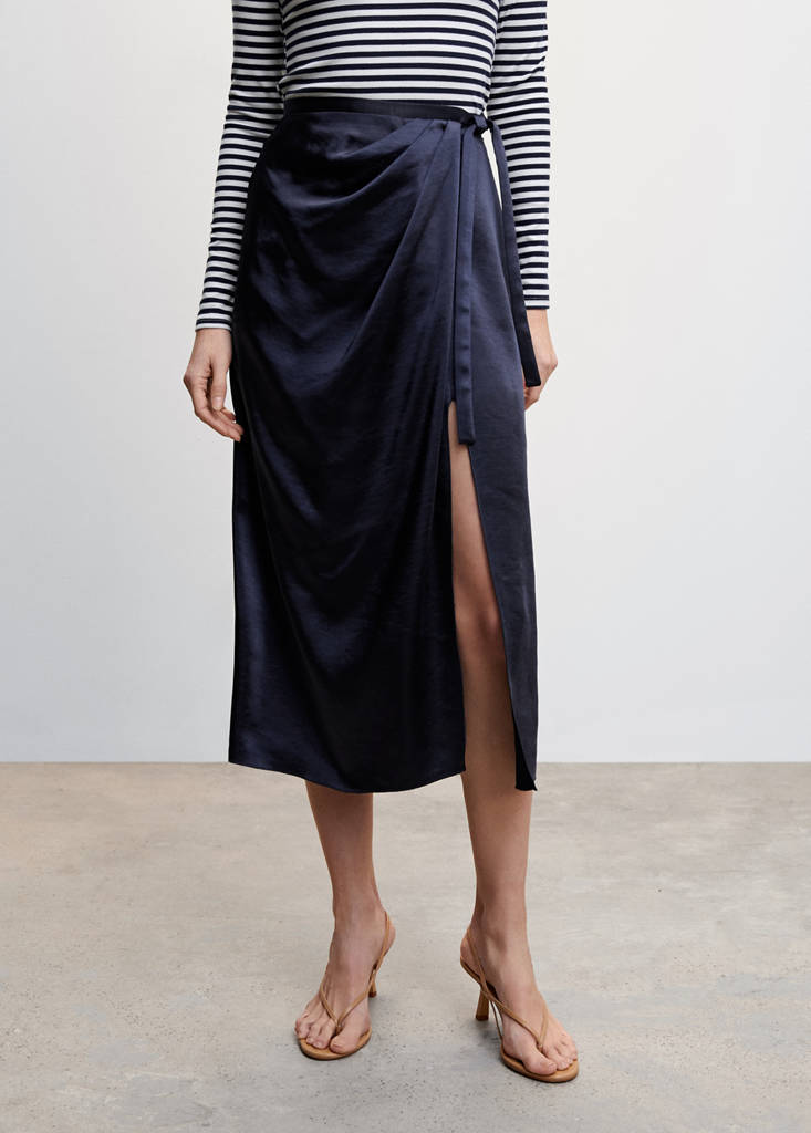 Fließender Stoff. Satin. Wickel-Design. Mid-Design. Mittlerer Sitz. Seitlicher Reißverschluss. Seitlicher Schleifenverschluss. Kräuseldetail. Seitenschlitz. Plus erhältlich