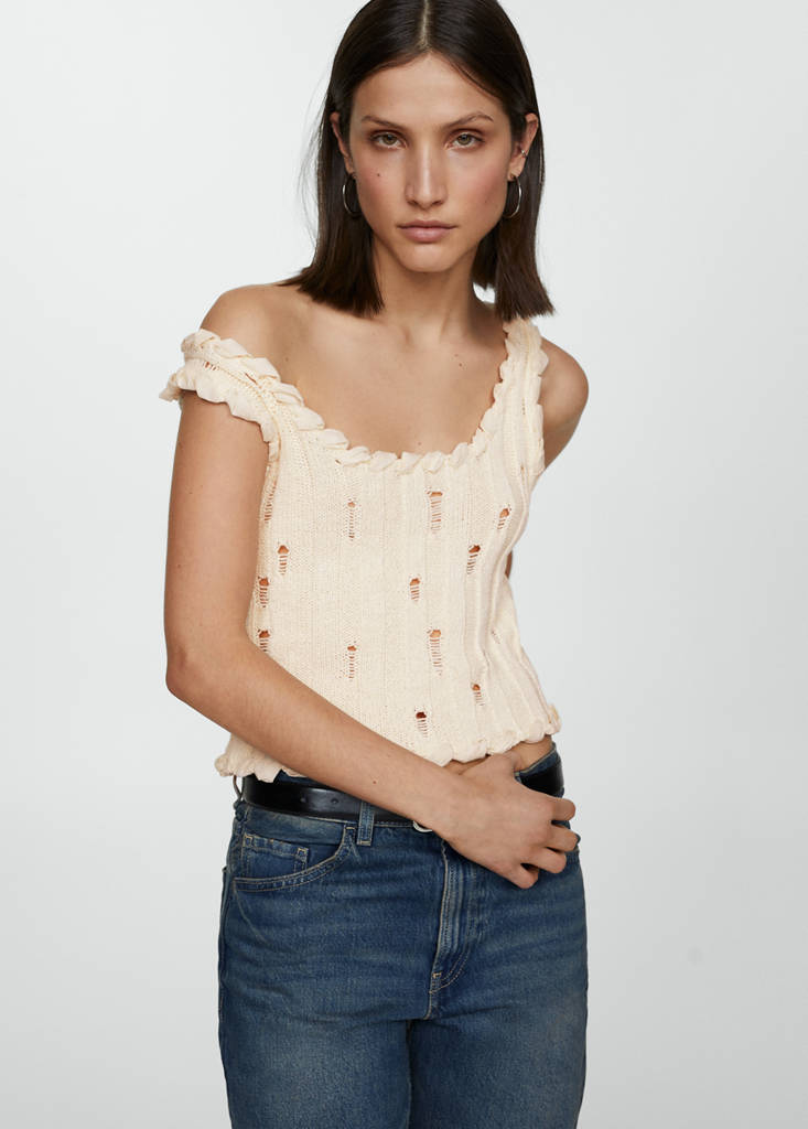 Baumwollmischgewebe. Grobstrickstoff. Gerades Design. Ärmellos. Breite Träger. Tiefer Ausschnitt. Dekorative Abschlüsse. Detail mit Zierrissen