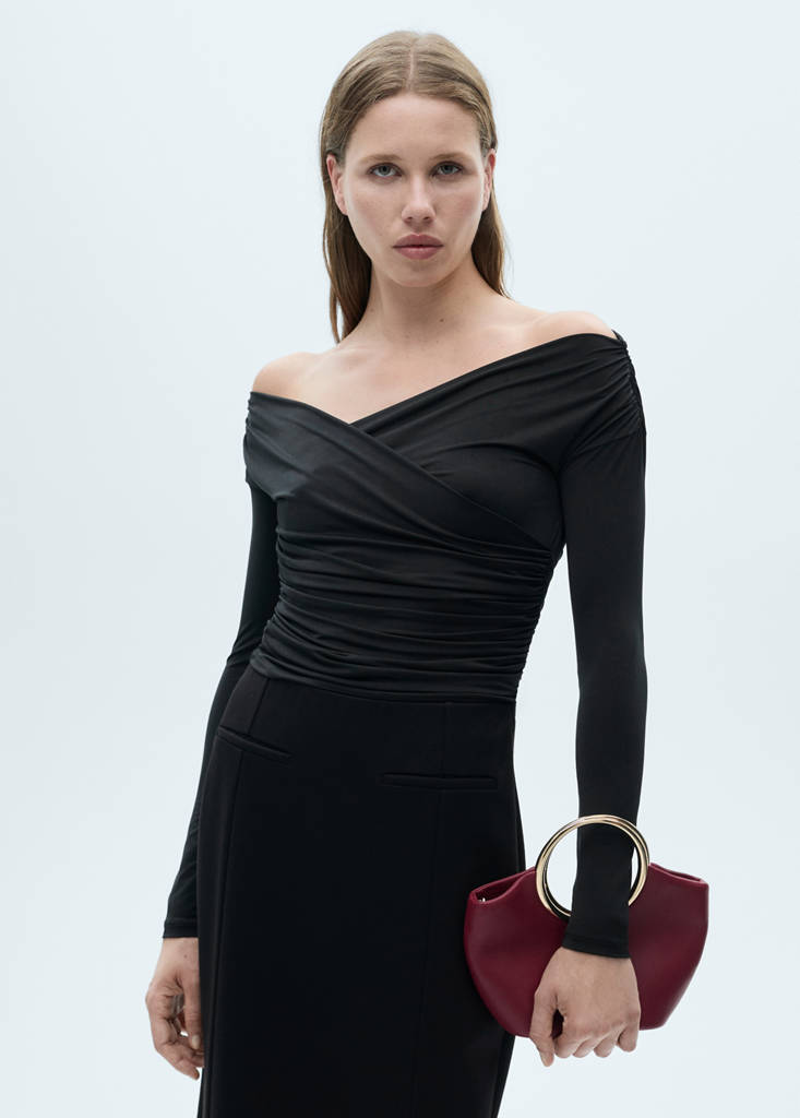 Gerades Design. Tailliertes Design. Off-Shoulder Design. Gekreuztes Design. Carmen-Ausschnitt. Lange Ärmel. Ohne Verschluss. Gerüschte Details