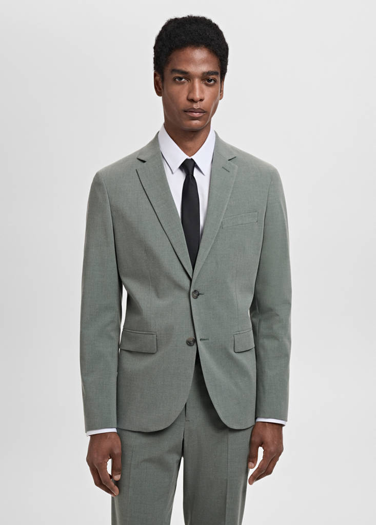 Super Slim Fit. Stretchstoff. Reverskragen. Fallendes Revers und Knopfloch. Vorderer Verschluss mit Knöpfen. Brustleistentasche. Zwei Paspeltaschen und Pattentaschen vorne. Manschetten mit Knopfverschluss. Doppelschlitz hinten am Saum. Innenfutter. Zwei Innentaschen