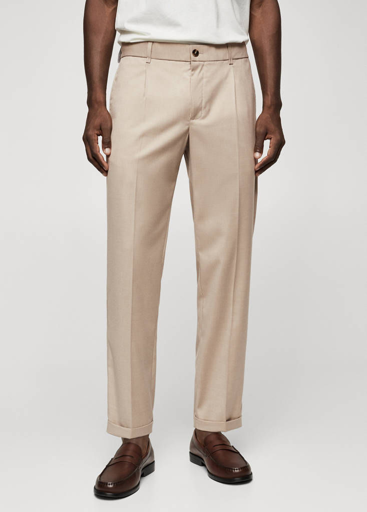 Slim Fit. Bundfalten. Gürtelschlaufen. Rückwärtiger Gummizug. Zwei Seitentaschen. Zwei Pattentaschen hinten. Umschlag am Saum. Reiß- und Knopfverschluss. Das Model ist 187 cm groß und trägt Größe 42