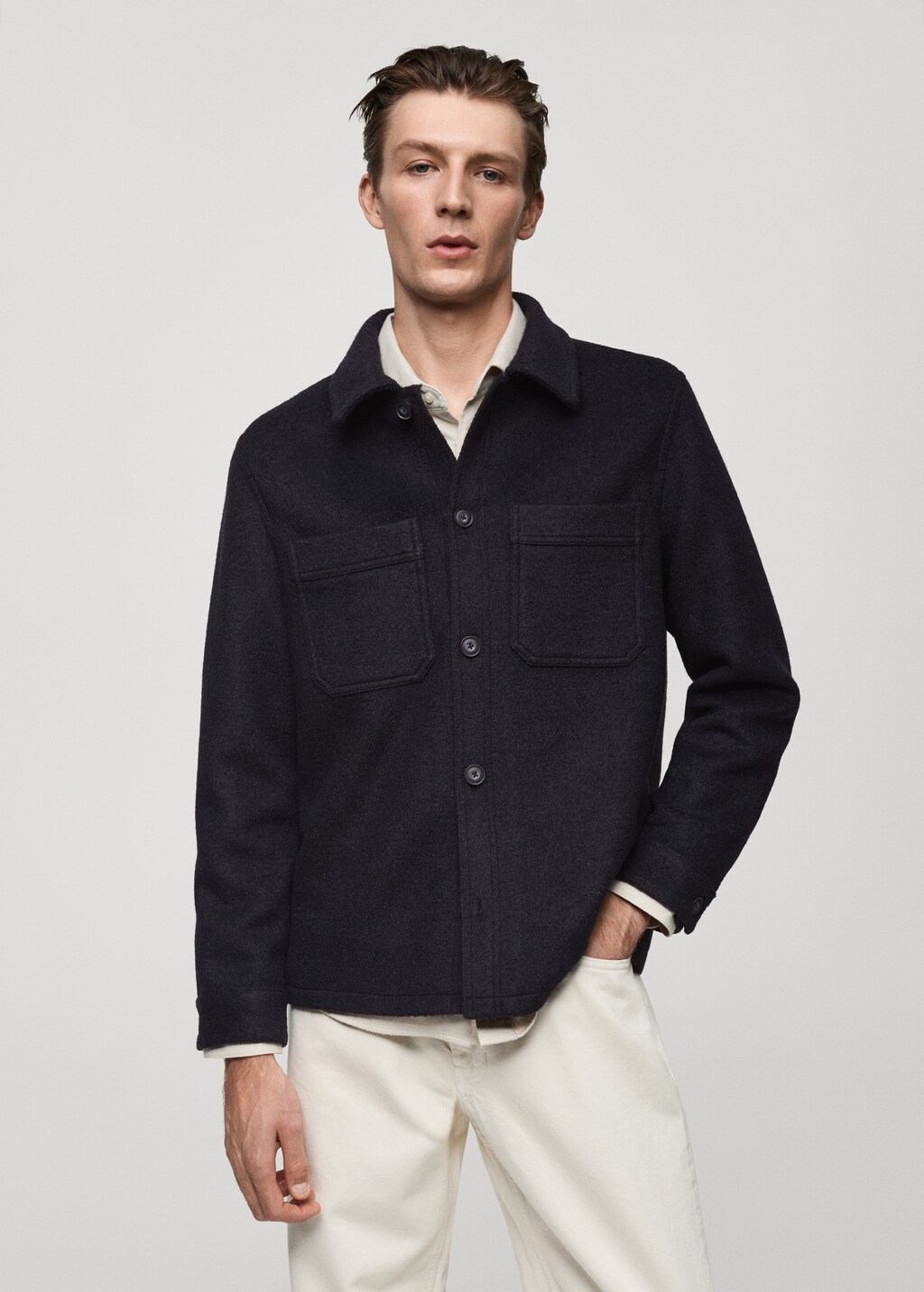Woll-Mischgewebe. Knopfverschluss. Hemdkragen. Zwei aufgesetzte Taschen vorne. Knopfmanschetten. Langarm. Futter.
