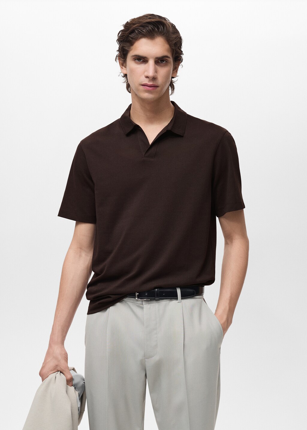 ESSENTIALS: Hergestellt, um zu halten. Slim Fit. Baumwollpikee. Polo-Kragen mit V-Ausschnitt ohne Verschluss. Kurzarm. Gerader Saum. Die Farbe Weiß ist exklusiv online.