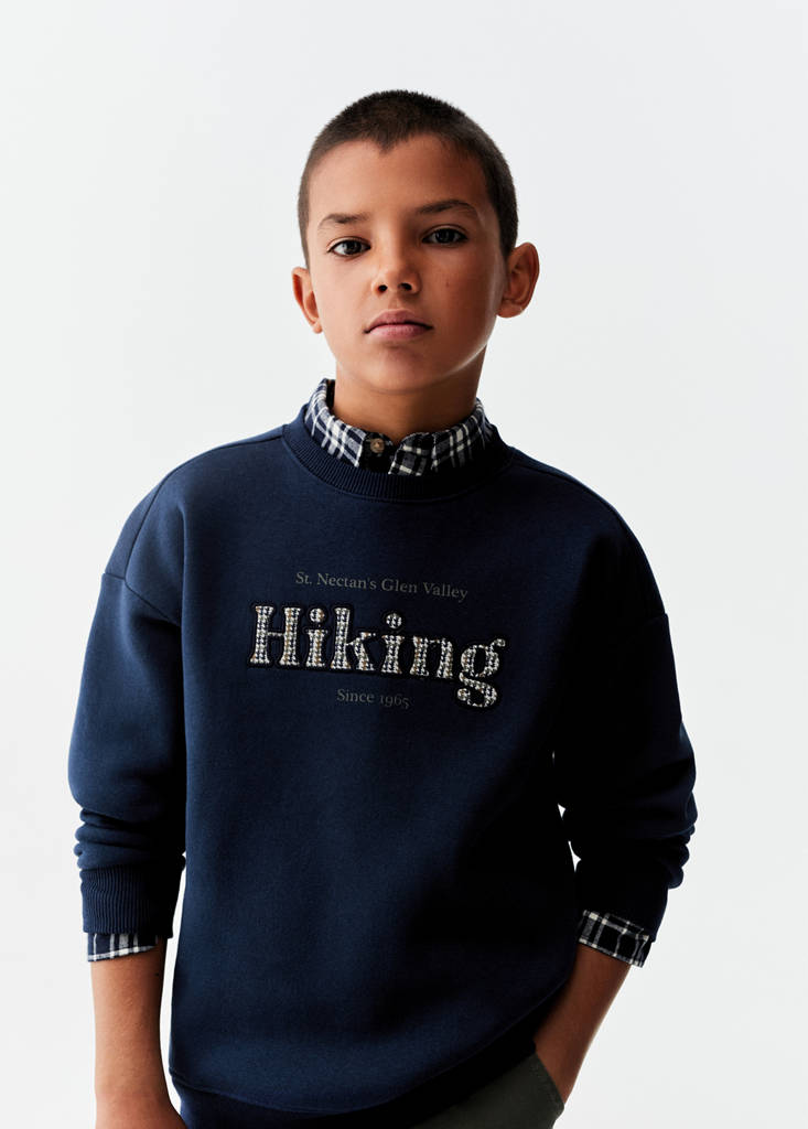 Baumwolle. Gebürstetes Gewebe. Gerader Schnitt. Bedruckte Botschaft. Rundhalsausschnitt. Lange Ärmel