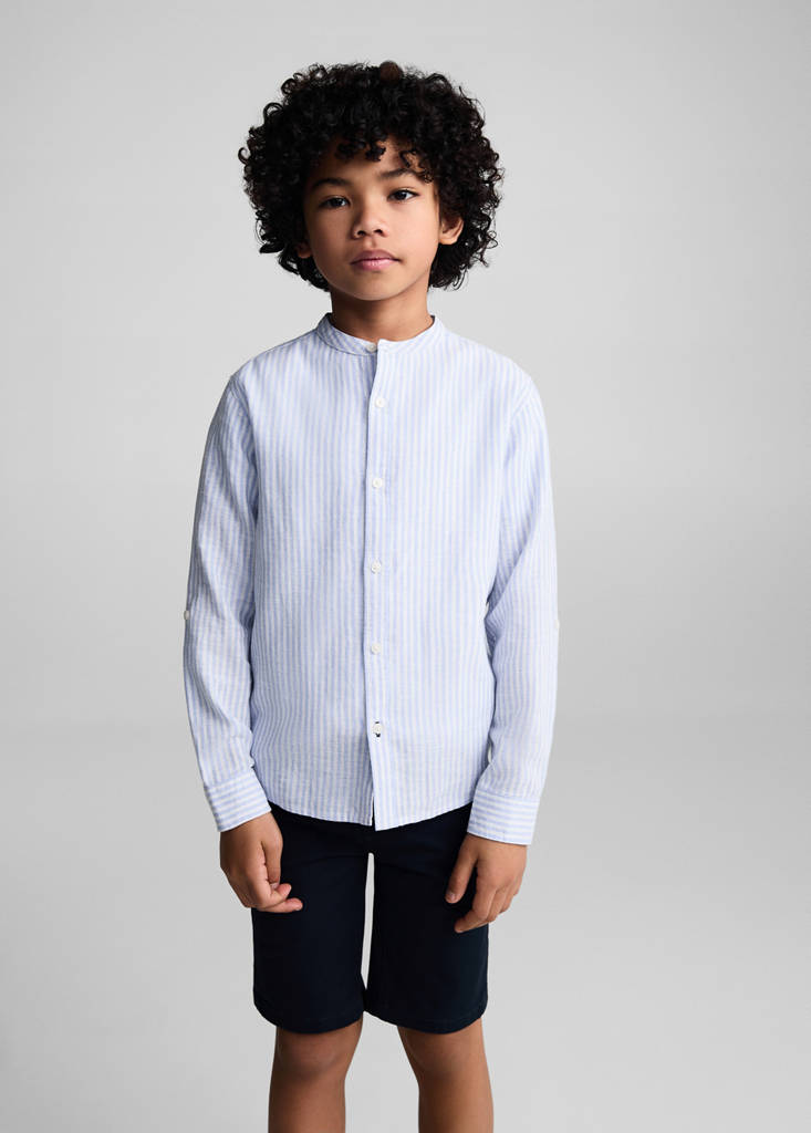 Baumwoll-Leinen-Mischgewebe. Streifenmuster. Regular Fit. Knopfmanschetten. Mandarinkragen. Lange Ärmel. Knopfverschluss