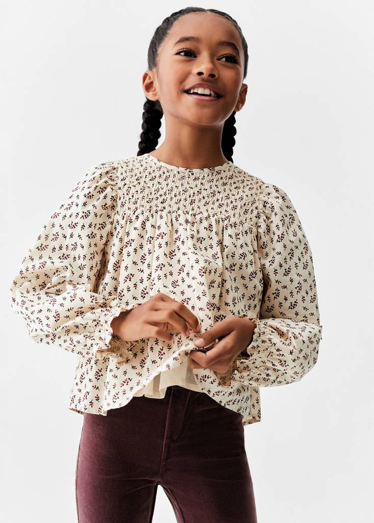 100% Baumwolle. Blumenmuster. Ärmelbündchen mit Raff-Details. Kräuseldetail. Gerader Schnitt. Rundhalsausschnitt. Lange Ärmel. Rückwärtiger Verschluss. Knopfverschluss