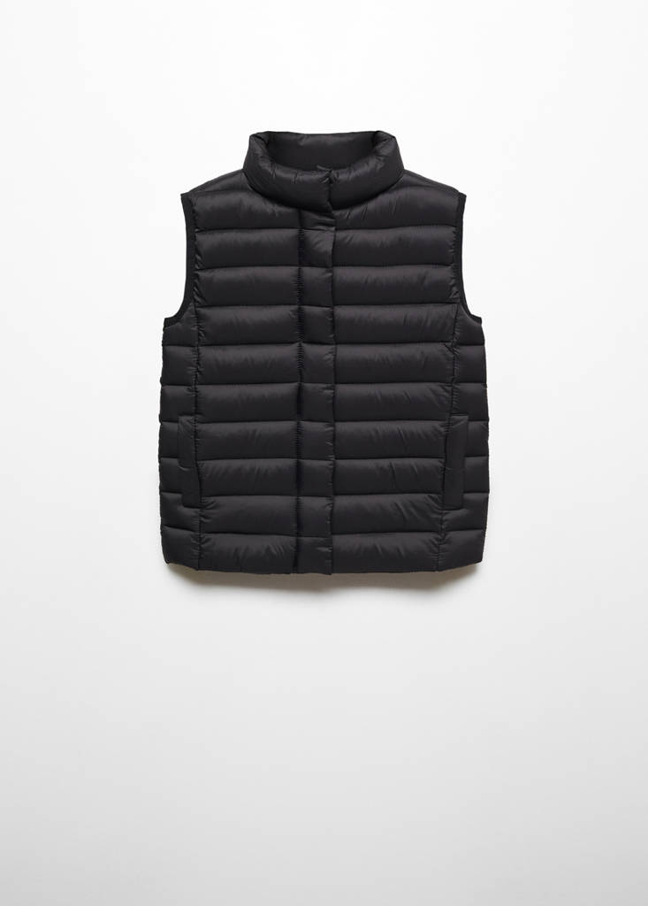 Gestepptes Design. Schornsteinkragen. Gerader Schnitt. Medium Design. Ärmellos. Vorderer Verschluss. Reiß- und Knopfverschluss. Druckknopfverschluss