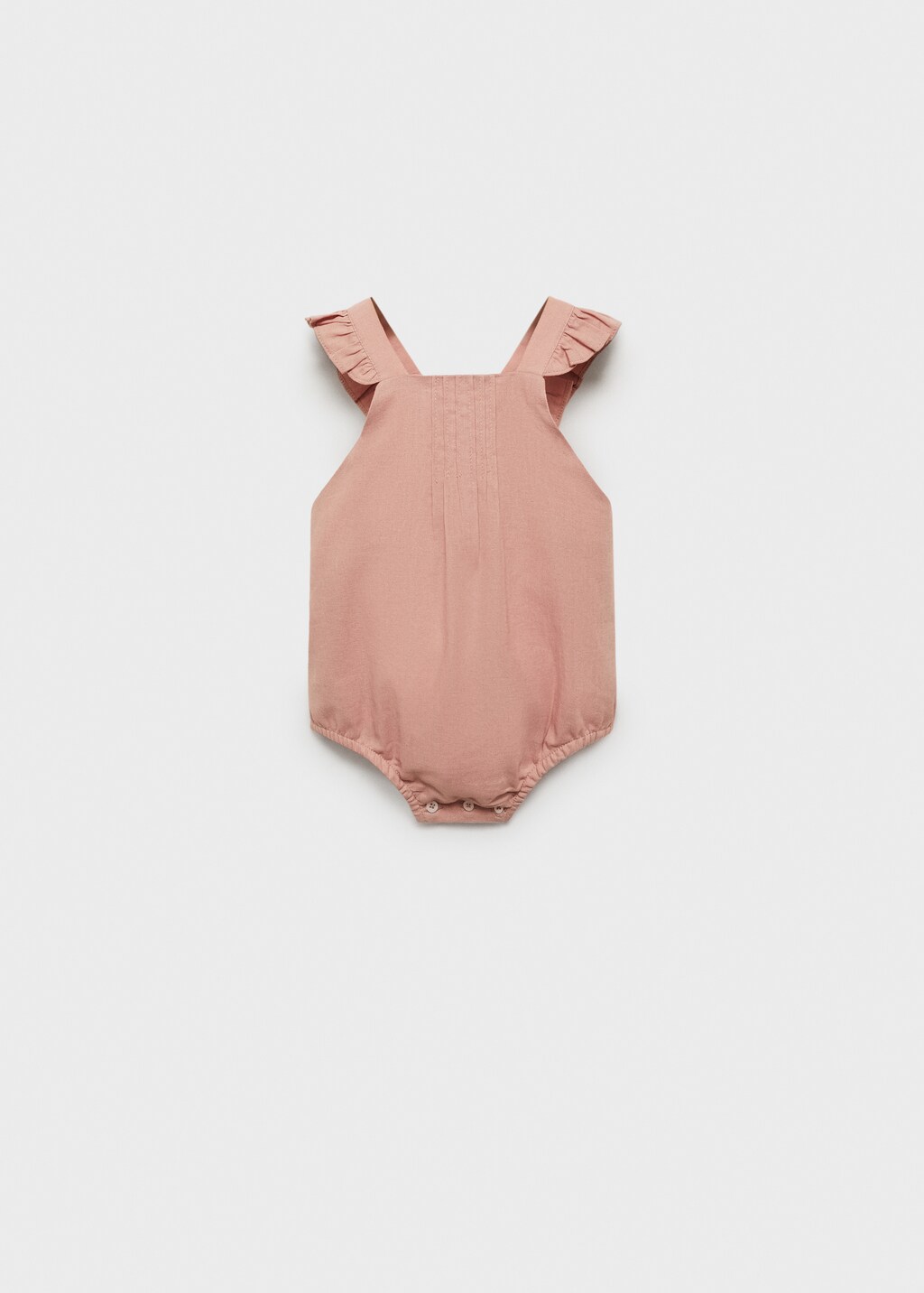 Baumwollstoff. Leinenstoff. Quadratischer Ausschnitt. Rüschenträger. Plissiertes Detail. Bund mit Gummizug. Saum mit elastischem Gummi. Schlitz am Saum mit Knopfverschluss.