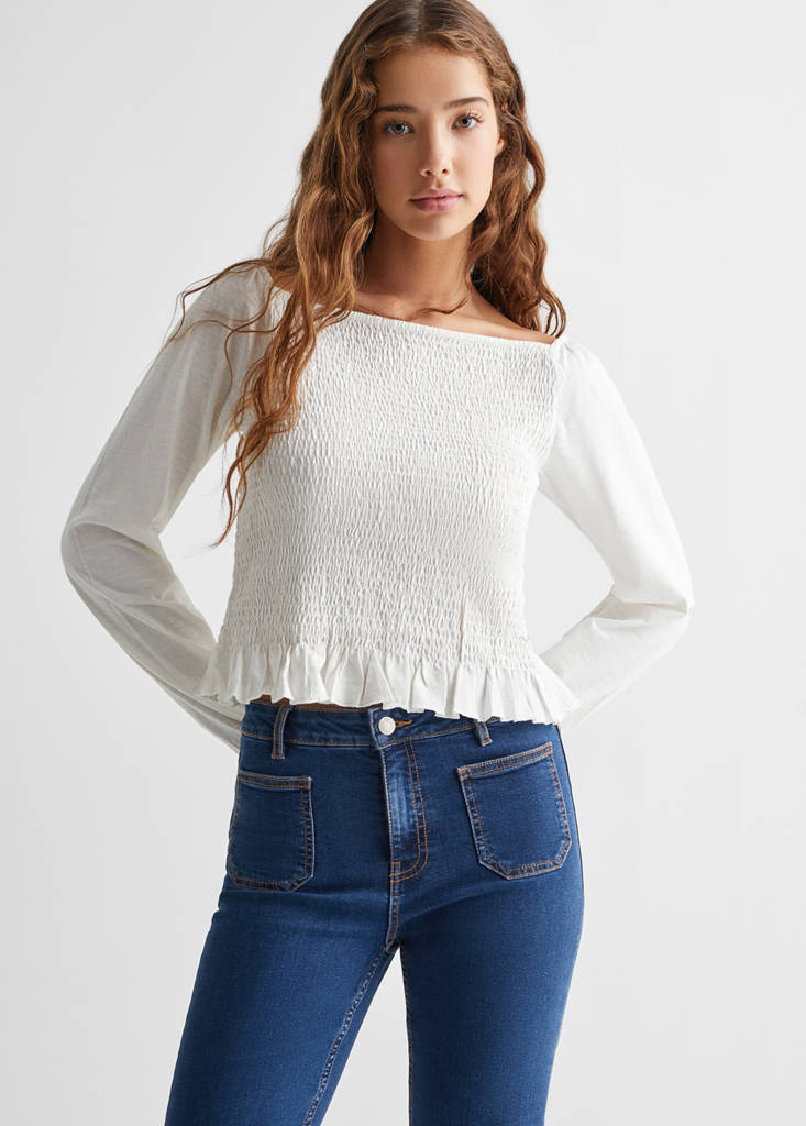 Baumwollstoff im Jeans-Stil. Langes Design. Im Flared-Stil. Mittlere Bundhöhe. Zwei Vordertaschen. Reißverschluss und Knopfverschluss. Ausgefranster Saum. Gesäßtaschen