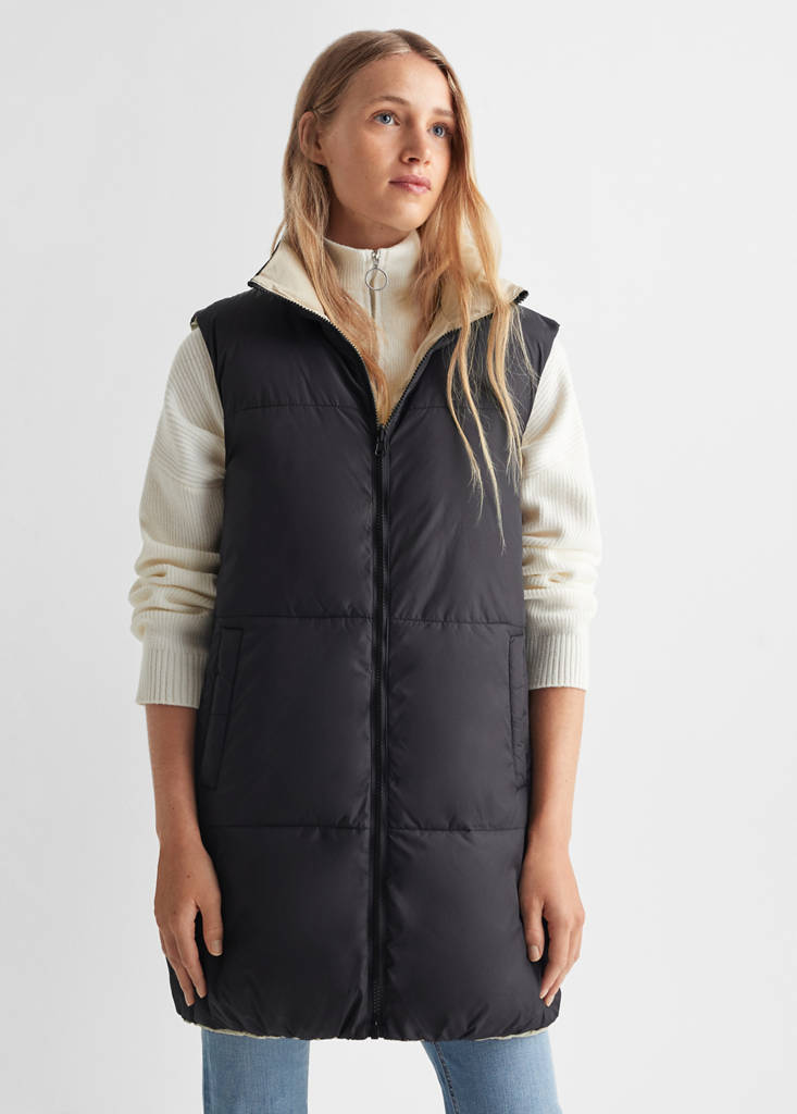 Langes Design. Gestepptes Design. Gerader Schnitt. Zwei Pattentaschen. Reißverschluss. Vorderer Verschluss