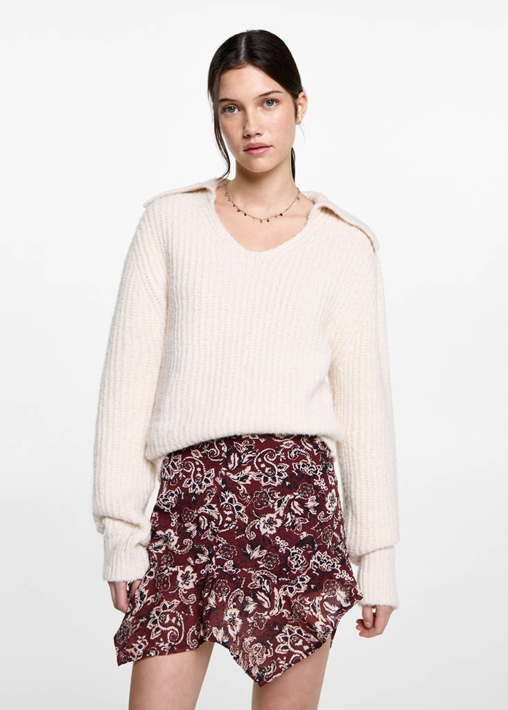 Fließender Stoff. Bedrucktes Design. Asymmetrisches Design. Kurzes Design. Unsichtbarer seitlicher Reißverschluss