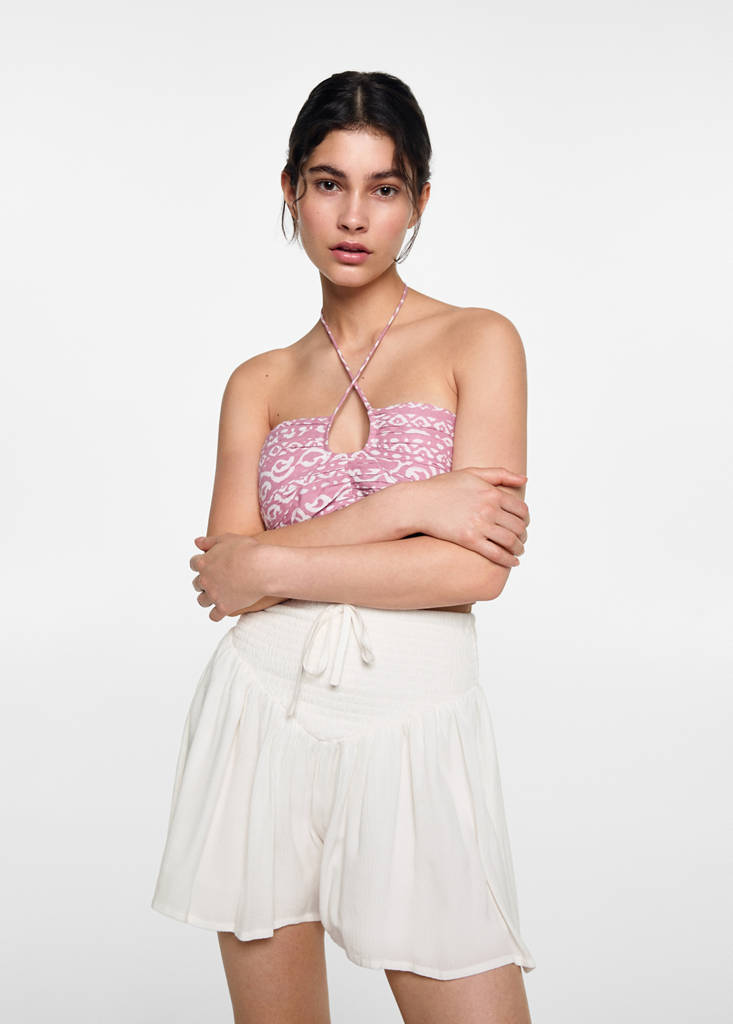 Kurzes Design. Ausgestelltes Design. Chiffonstoff. Gerafftes Panel. Bund mit Gummizug. Verstellbare Schleife am Bund. Innenfutter aus Baumwolle