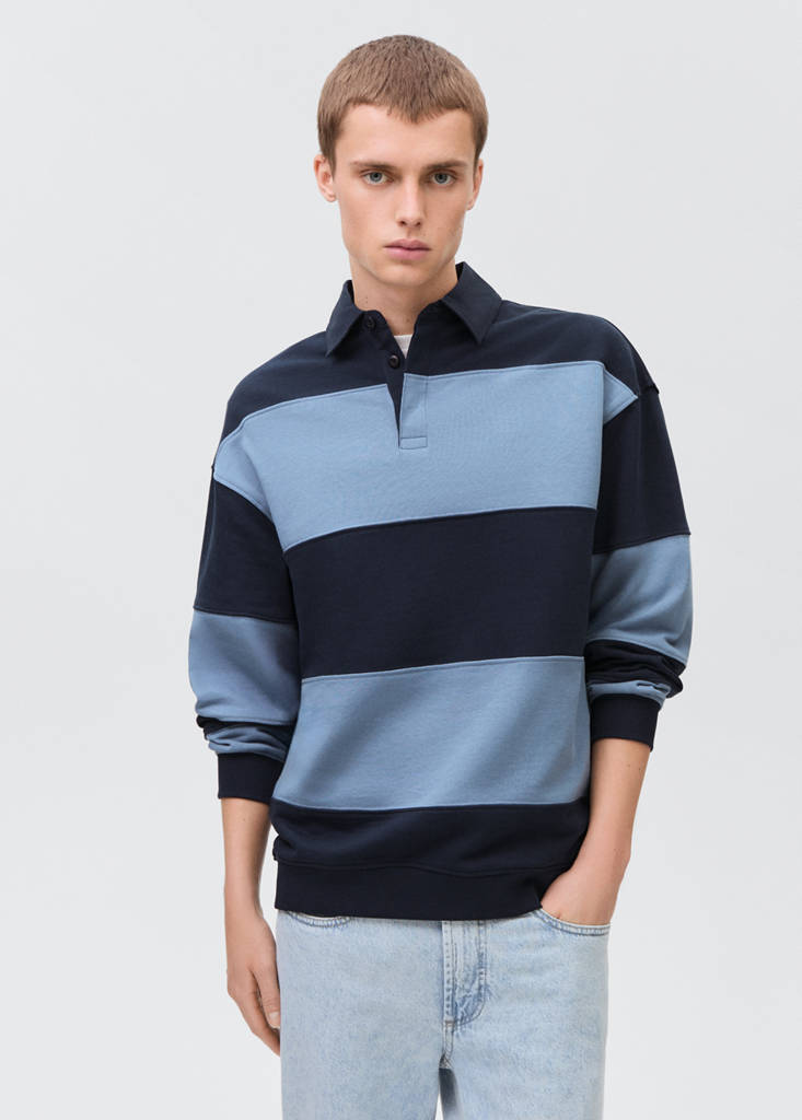 100 % Baumwolle. Gerades Design. Streifendesign. Poloshirtkragen ohne Knöpfe. Lange Ärmel. Ärmelbündchen und Saum mit gerippten Abschlüssen