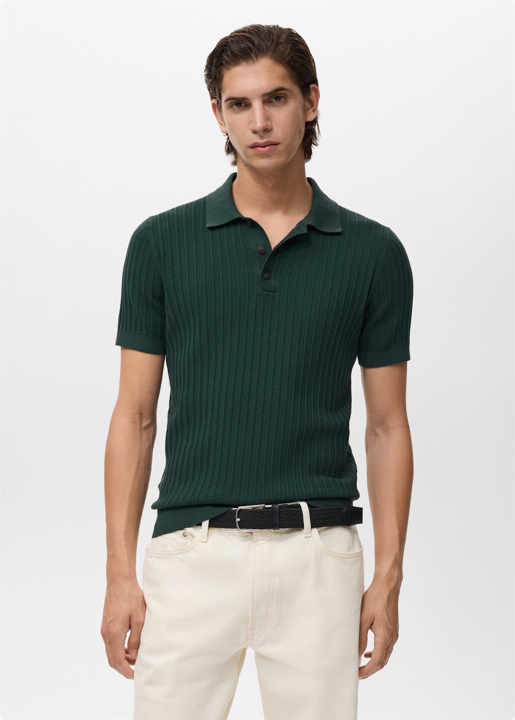 Regular fit. Cotton blend fabric. Fine-knit fabric. Herringbone structure. Polo-neck with button closure. Short sleeves. Straight hem.