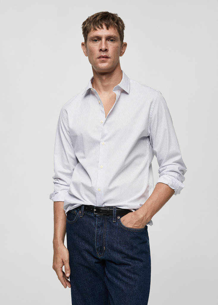 Slim fit striped cotton shirtPrice historyInitial price struck through [€ 49,99 ]€ 49,99Second price struck through [€ 38,99 ]€ 38,99Current price [€ 13,99 ]€ 13,99-72%Select a colourWhiteThe model is wearing size M and is 185cm tall.Select your sizeXSLast few items!SLast few items!MNot available. I want it!LNot available. I want it!XLNot available. I want it!MeasurementsAddSlim fit. Cotton fabric. Vertical stripe design. Long sleeves. Classic button-down collar. Buttoned cuffs. Rounded baseDetails, composition and careStore availability