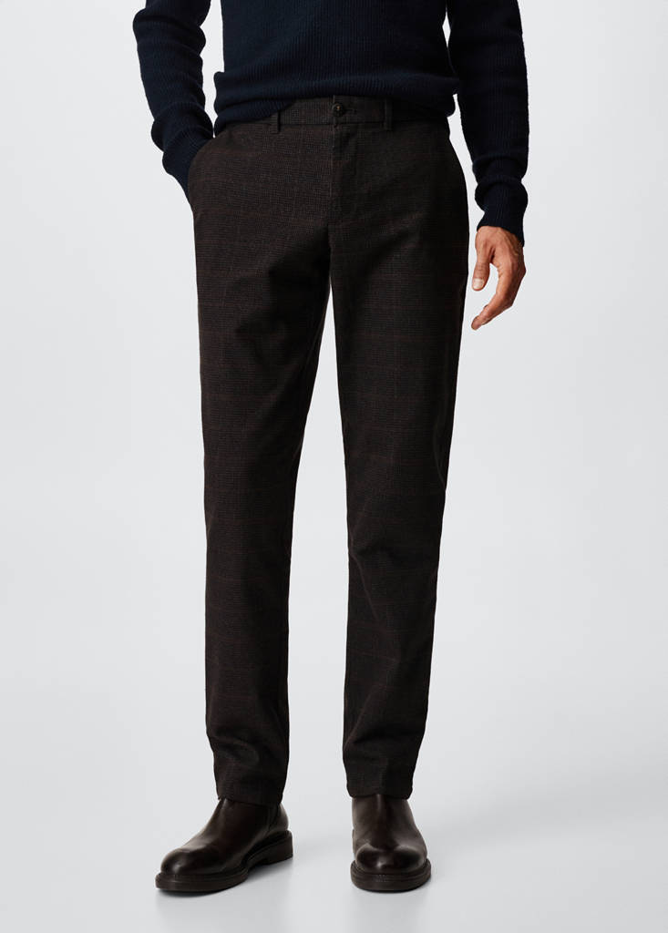 Basics Collection. Slim fit. Windowpane check design. Cotton-blend fabric. Elastic back waistband. Loops. Zip and one button fastening. Two side pockets. Two welt pockets on the back. The model is 187 cm tall and is wearing a size 42