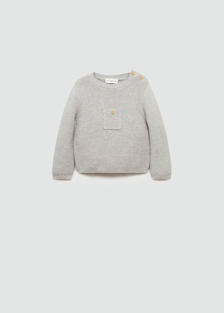 Knit pocket sweaterPrice historyInitial price struck through [€ 19,99 ]€ 19,99Second price struck through [€ 15,49 ]€ 15,49Current price [€ 6,99 ]€ 6,99-65%Select a colourMedium Heather GreySelect your size1-3 months (62cm)Not available. I want it!3-6 months (68cm)Not available. I want it!6-9 months (74cm)Not available. I want it!9-12 months (80cm)Last few items!12-18 months (86cm)Not available. I want it!18-24 months (92cm)Not available. I want it!DimensionsAddKnit fabric. Straight design. Round neck. Patch pocket. Long sleeves. Side button fastening. Set available as total lookDetails, composition and careStore availabilityItem qualitiesRecycled cottonAt least 20%This fibre is obtained from pre- and post-consumer textile waste that is transformed into new fabrics.