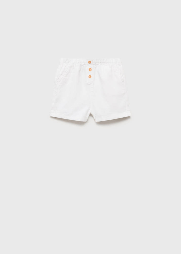 Cotton and linen fabric. Short design. Straight design. Two front pockets. Wood effect buttons. Elasticated waistband