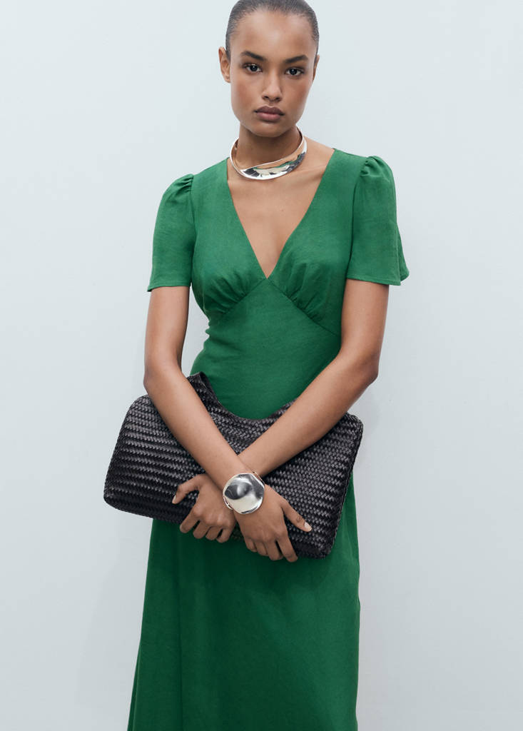 Linen mix. A-line design. Midi design. Floral print. V-neck. Short sleeves. Draped neck. Ribbon on the waist with tie closure. Side zip closure. Available Plus