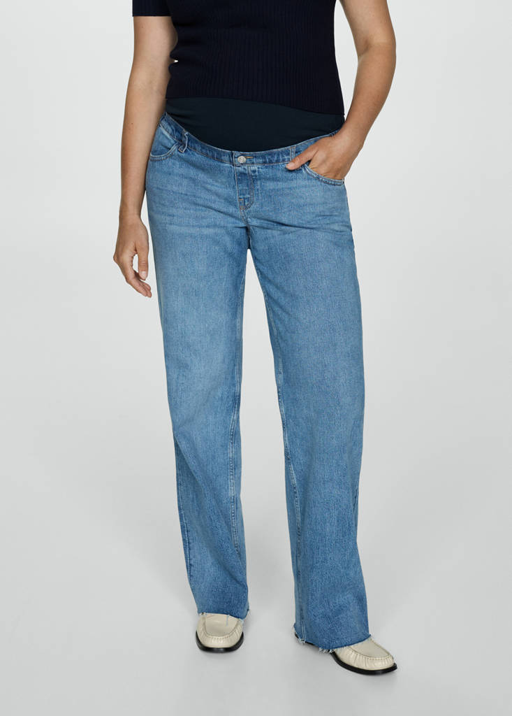 Denim-style cotton fabric. Wide-leg design. Low waist. Belt loops. Five pockets. Elasticated waistband. Soft elastic at front side waistband for added comfort and support the growing bump. No Fastening. Decorative button. Inseam 78 cm. We recommend you buy your usual size. Provides comfort and freedom of movement. Maternity