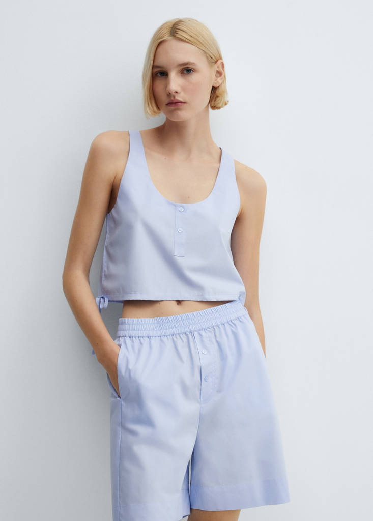 Cotton pyjama crop topPrice historyInitial price struck through [€ 25,99 ]€ 25,99Second price struck through [€ 17,99 ]€ 17,99Current price [€ 4,99 ]€ 4,99-81%Select a colourSky BlueThe model is wearing size S and is 179cm tall.Select your sizeXSLast few items!SNot available. I want it!MNot available. I want it!LNot available. I want it!DimensionsAddCrop design. Straight design. Low neckline. Sleeveless. Wide straps. No Fastening. Decorative buttons. Total lookDetails, composition and careStore availability