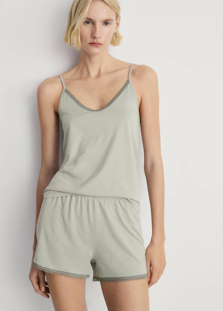 Pyjama top. Cotton and modal mix. Pleasant texture. Contrasting lace trims. V-neck. Thin straps. Provides comfort and freedom of movement. Available in different colours. Coordinates with more products from the collection