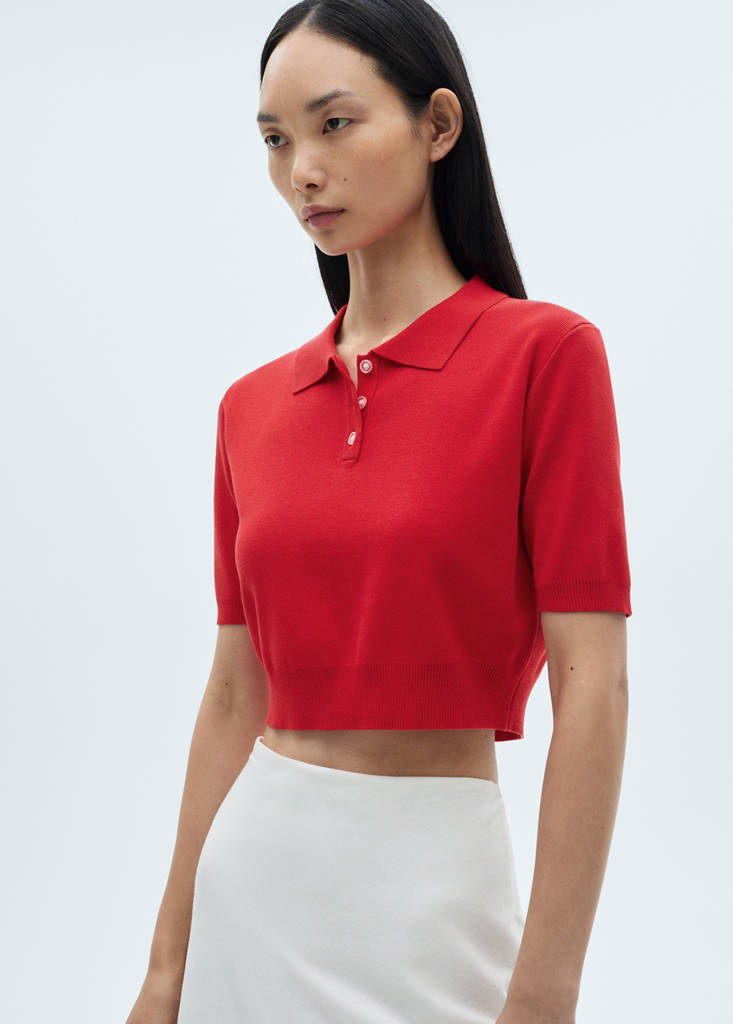 Fine knit fabric. Crop design. Straight design. Polo collar. Short sleeves. Button fastening at the front