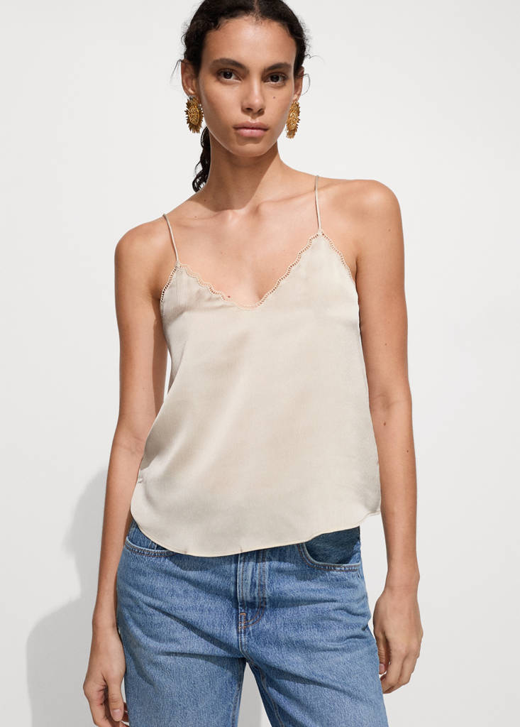 Satin top with strapsPrice historyInitial price struck through [€ 22,99 ]€ 22,99Second price struck through [€ 15,99 ]€ 15,99Current price [€ 4,49 ]€ 4,49-80%Select a colourOff WhiteThe model is wearing size S and is 178cm tall.Select your sizeXXSNot available. I want it!XSNot available. I want it!SNot available. I want it!MNot available. I want it!LNot available. I want it!XLNot available. I want it!XXLNot available. I want it!Notify meSatin fabric. Straight design. V-neckline. Sleeveless. Thin straps. Lace detail. Festival SeasonDetails, composition and careStore availability