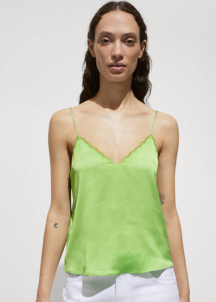 Satin top with strapsPrice historyInitial price struck through [€ 22,99 ]€ 22,99Second price struck through [€ 15,99 ]€ 15,99Current price [€ 4,49 ]€ 4,49-80%Select a colourGreenThe model is wearing size S and is 178cm tall.Select your sizeXXSNot available. I want it!XSSMNot available. I want it!LNot available. I want it!XLNot available. I want it!XXLNot available. I want it!AddSatin fabric. Straight design. V-neckline. Sleeveless. Thin straps. Lace detail. Festival SeasonDetails, composition and careStore availability