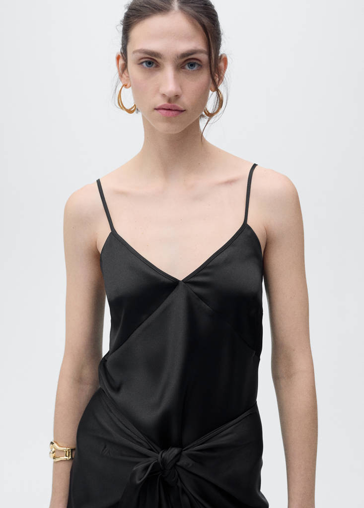 V-neck satin topPrice historyInitial price struck through [€ 29,99 ]€ 29,99Second price struck through [€ 19,99 ]€ 19,99Current price [€ 17,99 ]€ 17,99-40%Select a colourBlackThe model is wearing size S and is 177cm tall.Select your sizeXSLast few items!SLast few items!MLXLNot available. I want it!AddSatin fabric. Straight design. V-neck. Thin straps. No Fastening. Party, ceremony and communion collectionDetails, composition and careStore availability