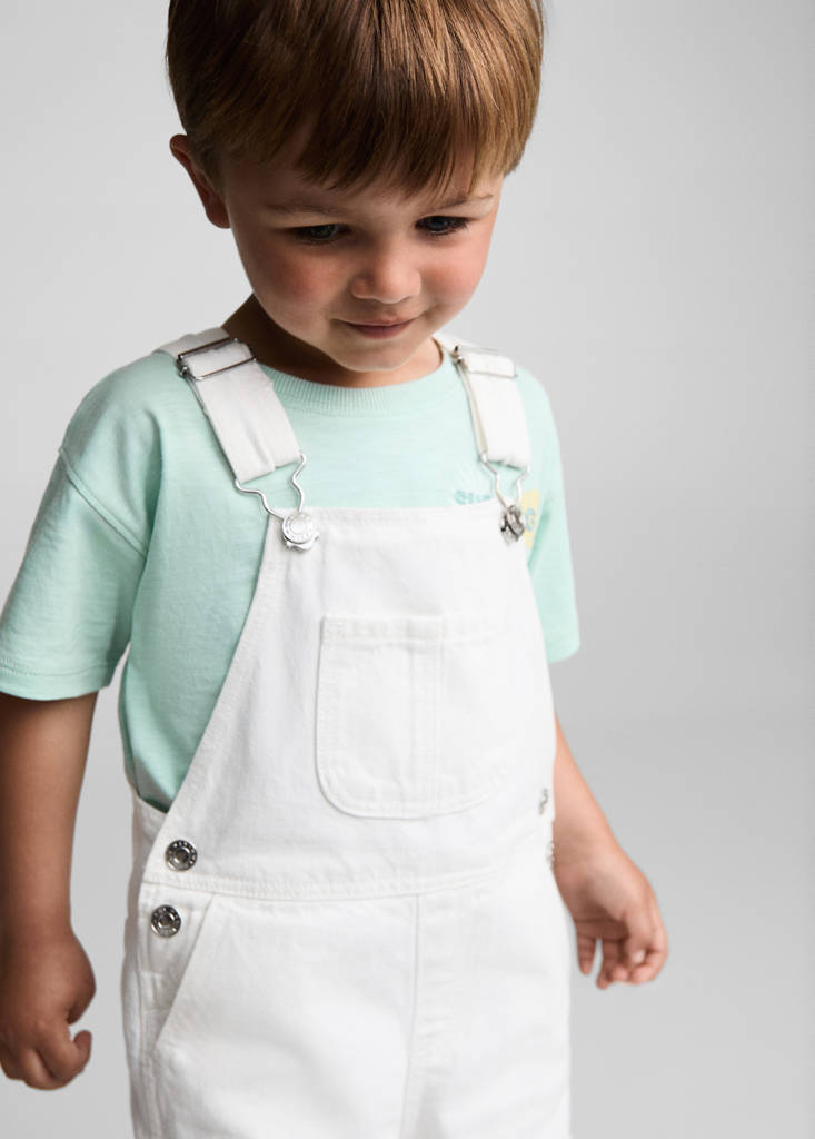 Baumwollstoff im Jeans-Stil. Kurzes Design. Gerader Schnitt. Breite Träger. Träger mit Knopfverschluss. Verstellbare Träger. Gerader Ausschnitt. Zwei seitliche Taschen. Aufgesetzte Taschen hinten. Seitlicher Knopfverschluss. Summer Camp