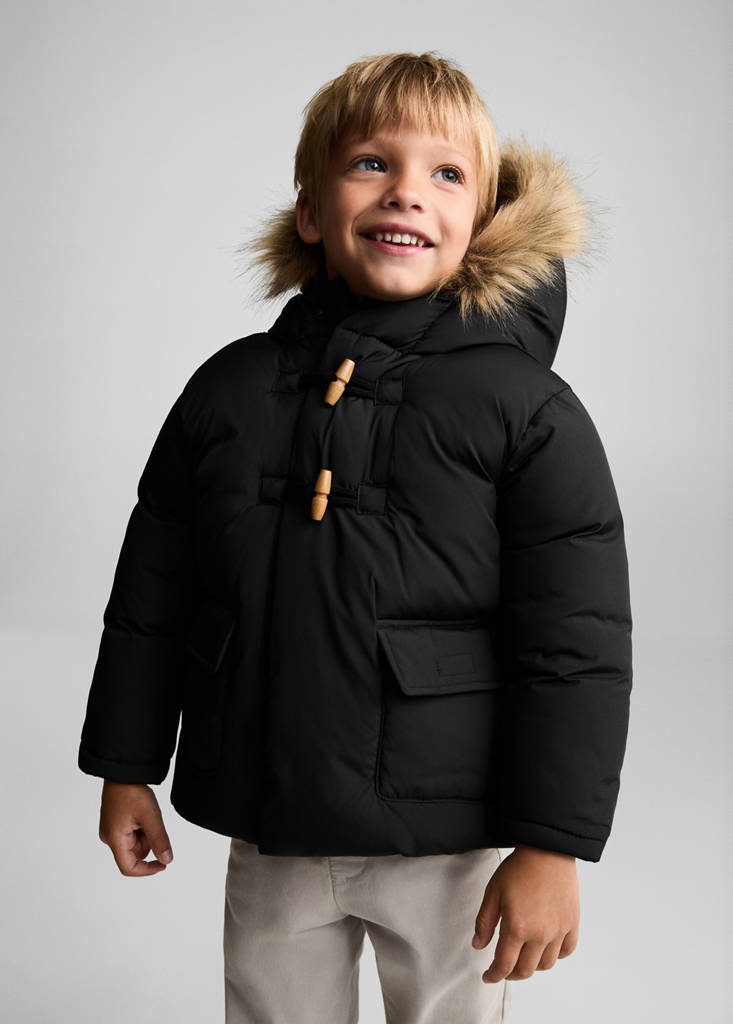 Back to School. Gestepptes Design. Rollkragen. Kapuze mit Detail aus Kunstpelz. Zwei seitliche Taschen. Etikett an der Innenseite für persönliche Daten. Gerades Design. Fleece-Futter. Mit Dufflecoatverschluss