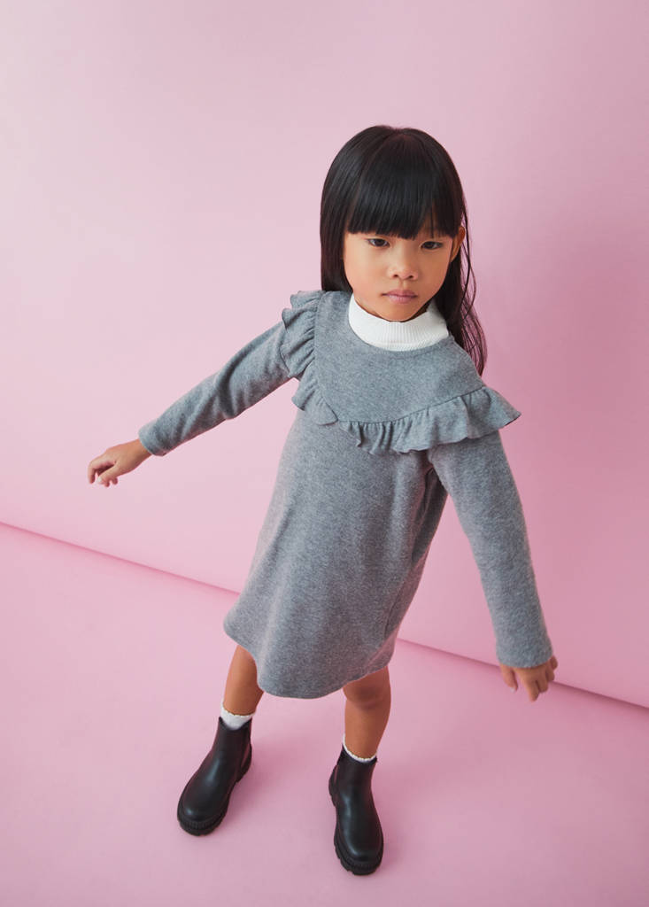 Strick. Melierter Stoff. Kurzes Design. Gerades Design. Dekorative Rüschen. Rundhalsausschnitt. Lange Ärmel. Tropfenverschluss hinten