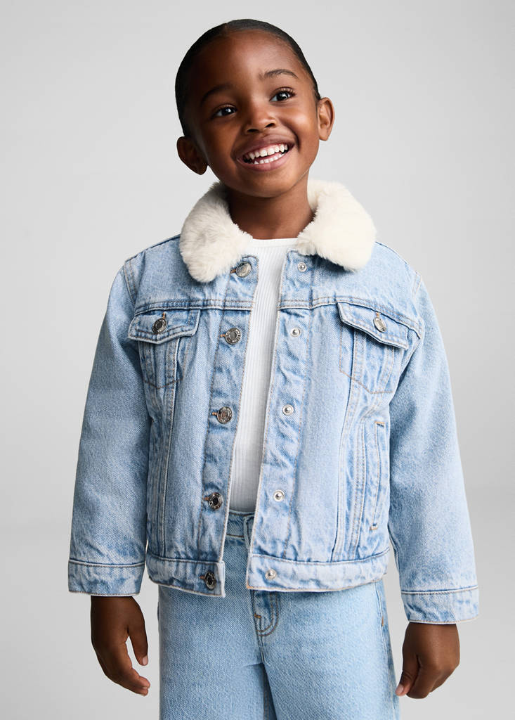 Baumwollstoff im Jeans-Stil. Gerades Design. Kontrastierender Kunstfellkragen. Lange Ärmel. Vier Taschen. Druckknopfverschluss