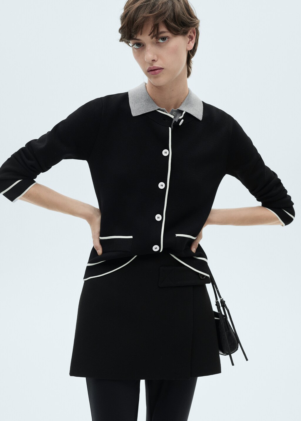 Feinstrick. Gerades Design. Langarm. Rundhalsausschnitt. Knopfverschluss vorne. Kontrastierende Abschlüsse.