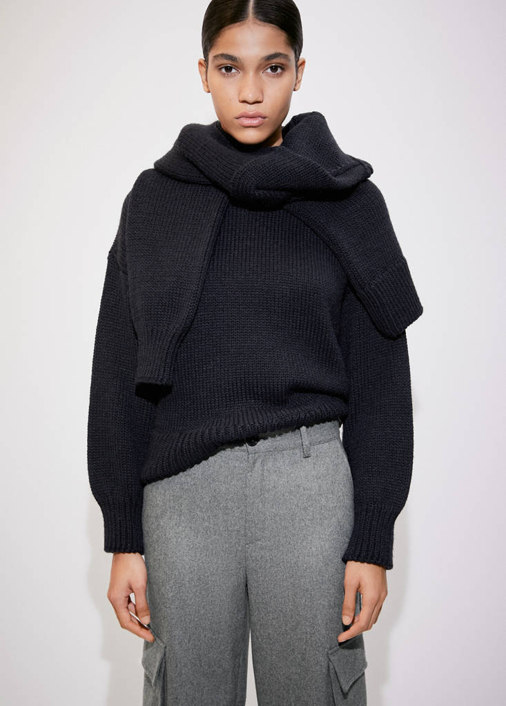 Beyond-Kollektion. Mischgewebe aus Recycling-Wolle. Cargo-Design. Langes Design. Mittlere Bundhöhe. Zwei seitliche Taschen. Zwei Cargotaschen. Reißverschluss und Knopfverschluss. Gürtelschlaufen. Futter. Die recycelte Wolle und das recycelte Polyester dieses Kleidungsstücks stammen aus Pre- und Post-Consumer-Textilabfällen, die in neue Garne und Stoffe umgewandelt werden