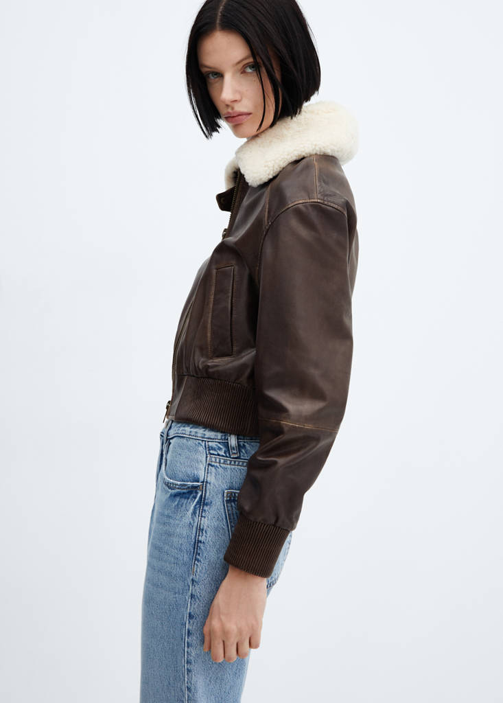 100% Schafleder. Bomber-Design. Kurzes Design. Hemdkragen. Abnehmbarer Kunstpelzkragen. Lange Ärmel mit elastischen Bündchen. Zwei seitliche Taschen. Reißverschluss auf der Vorderseite. Saum mit elastischem Gummi. Futter. Total Look