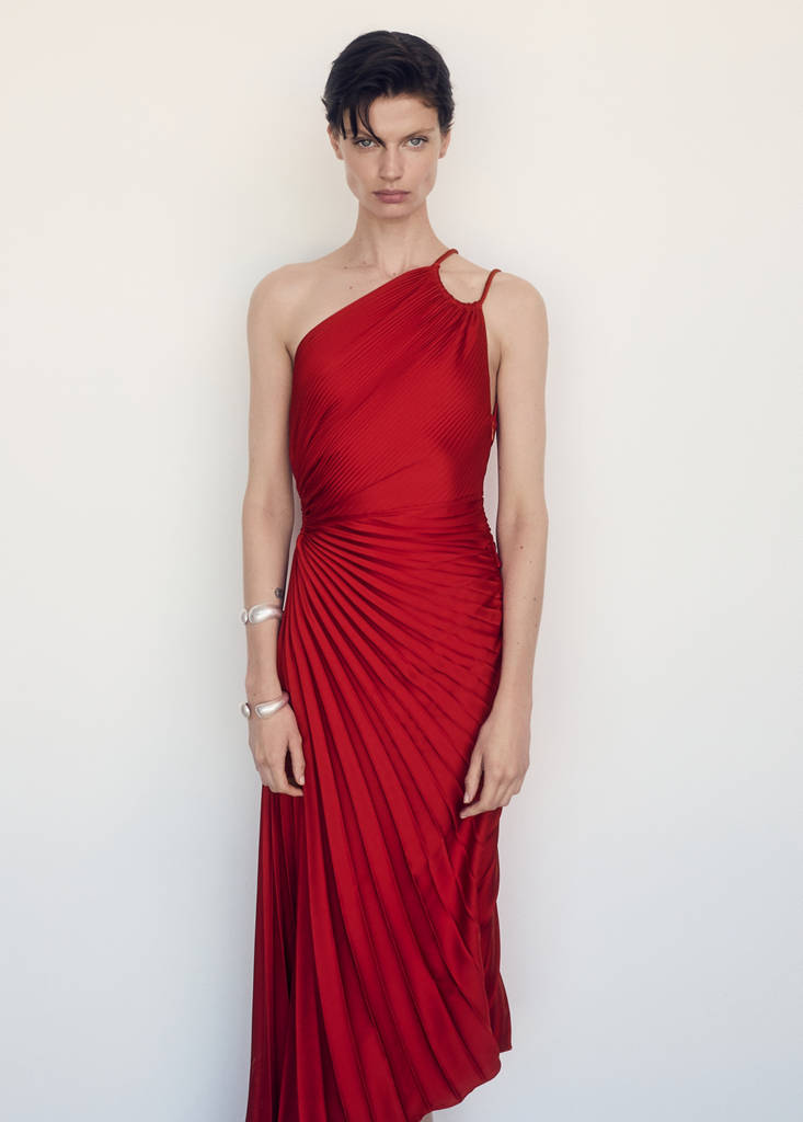 Plissierter Stoff. Gerades Design. Asymmetrisches Design. Midi-Design. Ärmellos. Breiter Träger. Seitenschlitz. Unsichtbarer seitlicher Reißverschluss. Futter. Asymmetrischer Saum. In Plus-Size erhältlich. Kollektion für Partys, Feierlichkeiten und Kommunionen. Dieses Kleidungsstück gehört zu unserer Event-Kollektion, die entworfen wurde, um dich zur perfekten Gästin bei jeder Party, Hochzeit oder Zeremonie zu machen.