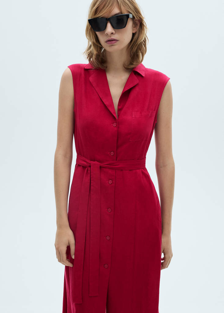 Leinen-Mix. Gerades Design. Hemdkragen. Hemdkragen mit Revers. Kerbrevers. Ärmellos. Eine frontale Pattentasche. Gürtel im Kimono-Stil. Vorderer Verschluss mit Knöpfen