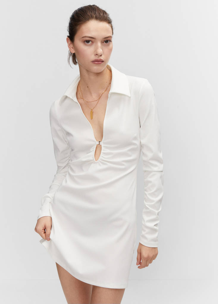 Fließender Stoff. Strukturierter Stoff. Kurzes Design. Gerades Design. Hemdkragen. Ausgeschnittener Kragen. Langer Raffärmel. Gerafftes Detaill am Ausschnitt. Verschluss vorne