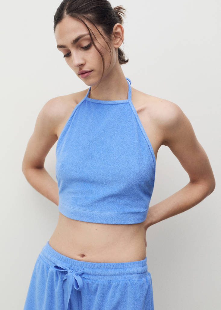 Baumwollstoff. Frotteestoff. Frottee-Effekt. Crop-Design. Schleifenverschluss. Passt zu weiteren Artikeln der Kollektion