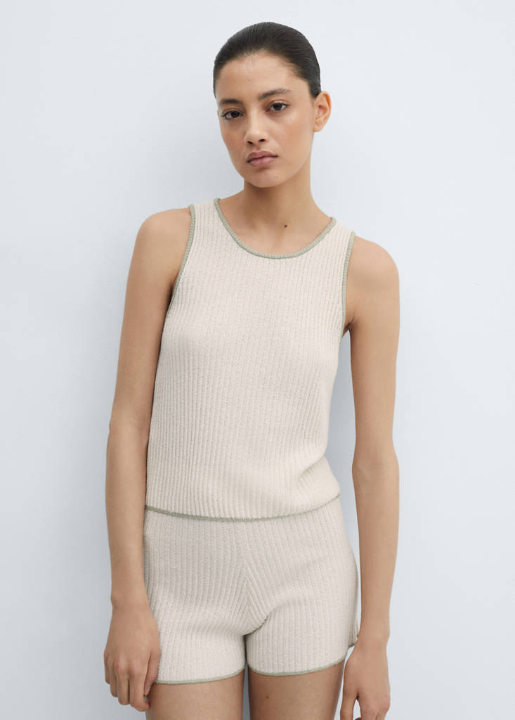 Gerippter Stoff. Stoff mit Struktur. Gerades Design. Rundhalsausschnitt. Ärmellos. Breite Träger. Ohne Verschluss. Kontrastierende Paspeln. Total Look