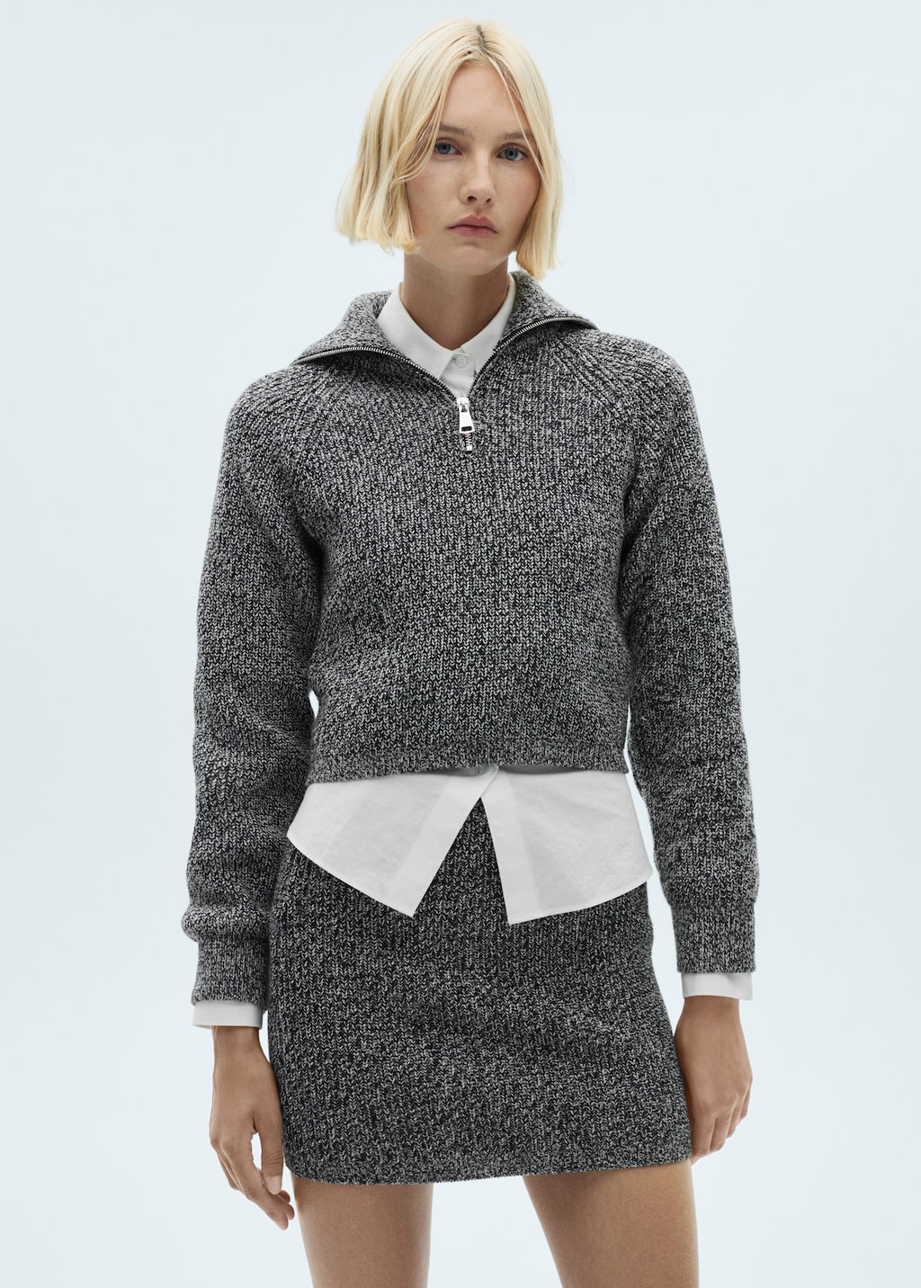 Mittlere Bundhöhe. Gerades Design. Kurzes Design. Bund mit Gummizug. Ohne Verschluss. Exklusiv online. Total Look. Strickstoff. Melierter Stoff.