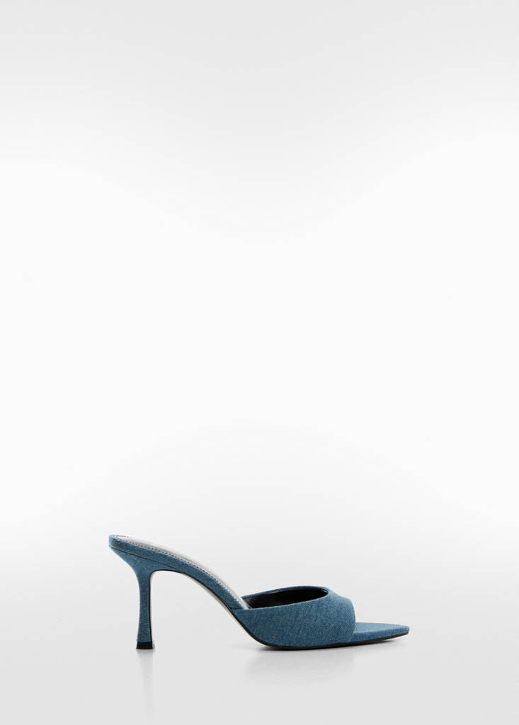 Baumwollstoff in Denim-Optik, fersenfrei, spitz zulaufend, trichterabsatz, absatzhöhe: 8 cm.
